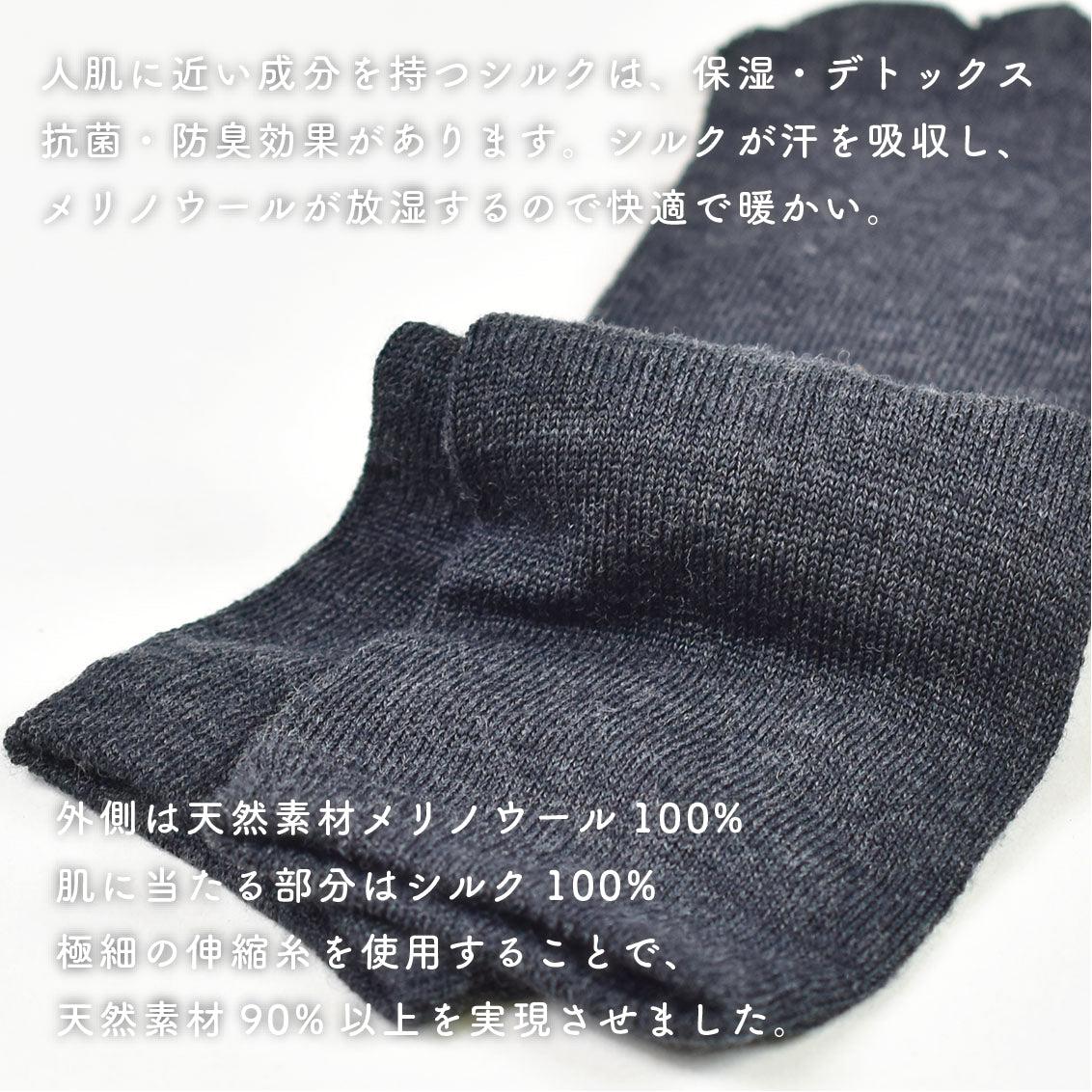 ・履いてごわつかないようにシルクとウールの間に通常使用するよりも半分以下の極細の伸縮糸を使用し履き心地の良さと天然素材95%以上を実現しました。